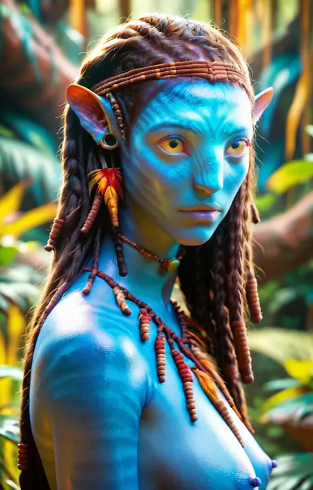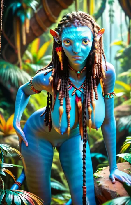 ilneytiri, 1girl, solo, blue skin, long hair, colored skin, pointy ears, breasts, necklace, yellow eyes, tribal, tail, earrings, freckles, blurry, blurry background, realistic, large breasts, nipples <lora:illustrious Neytiri -Avatar 02-1024x1600:1>, jungle, pussy, looking viewer, blue hands, blue pussy, BREAK 1man, leaning forward, sagging breasts, nude