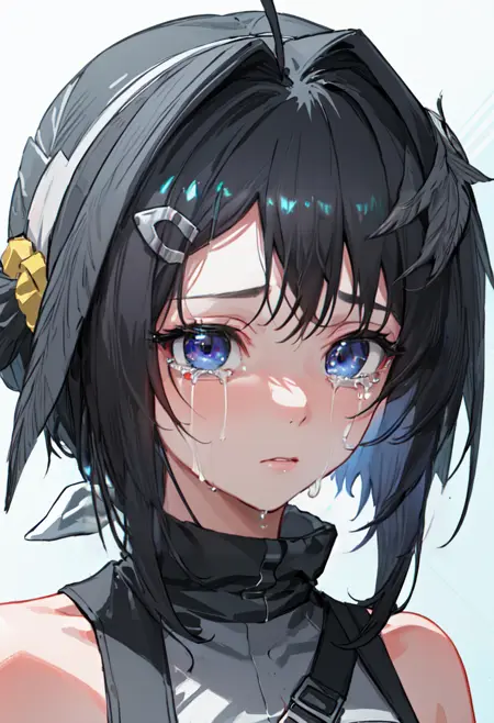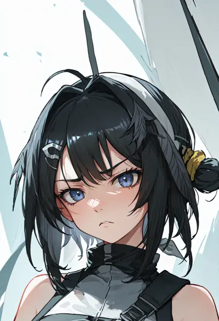 トリガーワードは la_pluma_arknights で、削減されたタグは black_hair, short_hair, breasts, hair_ornament, ahoge, hairclip, medium_breasts, black_eyes, hair_intakes, feather_hair です。ある時、特定の特徴(例:髪の色)が安定しない場合、これらのタグをプロンプトに追加できます。