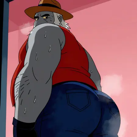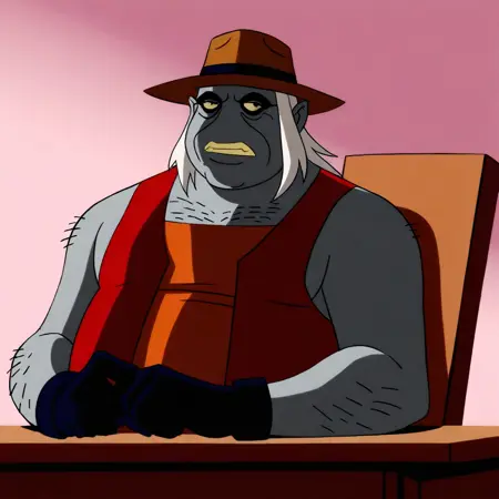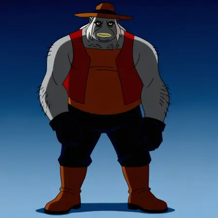 Pa Vreedle, old man, white hair, hairy arms, hairy chest, red vest, sleeveless, grey skin, fat man, yellow colored sclera, wrinkles, orange shirt, black eyes, brown headwear, black gloves