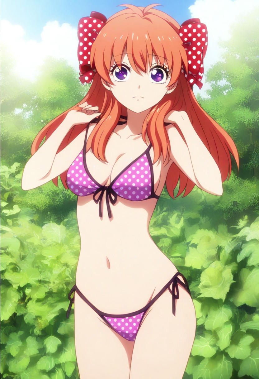 使用:千代 樱,长发,蝴蝶结,紫色眼睛,发带蝴蝶结,橙色头发,波点,波点蝴蝶结,