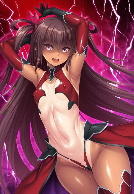 第六套服装:官方替代服装,第六套,堕落美月,堕落,黑色紧身衣,遮盖乳头,乳沟,黑色肘部手套,新娘手套,高开腿紧身衣,红色腰间斗篷,黑色过膝袜,部分显露的外阴