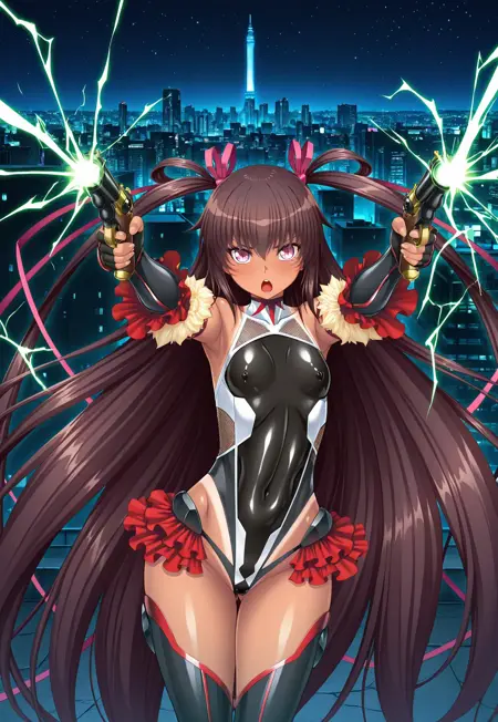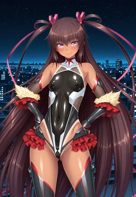 タグ:ツヤツヤの肌、ツヤツヤの服、濃い肌、濃い肌の女性、日焼け、日焼けの線、満月 雪風、ピンクの目、小さい胸、とても長い髪、茶色の髪、サイドアップ、ツインテール、髪リボン、ワンピースの日焼け