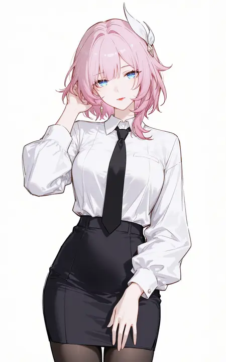 全身:cyrene\(honkai:star rail\),1girl,solo,pink short hair,white angular decoration between hair,blue eyes,