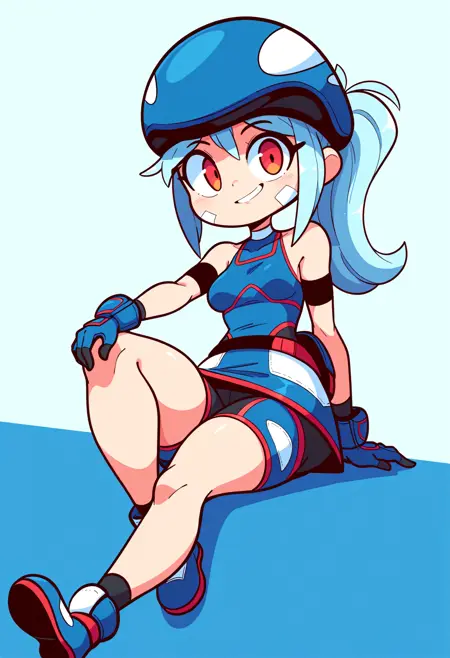 关键词为 marinabr,默认服装使用:蓝色头发、红色眼睛、马尾辫、侧发、蓝色头饰、蓝色上衣、蓝色裙子、蓝色短裤、蓝色手套、臂带、腰包、蓝色鞋子,