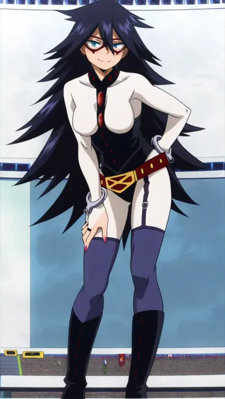 영웅 복장, 흰색 바디수트, 도미노 마스크, 검은 코셋, 가슴, 중간 크기 가슴, 허벅지 바지, 스트랩, 벨트, 부츠, 무릎 부츠, 하이힐, 손아귀,
