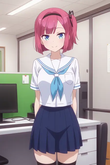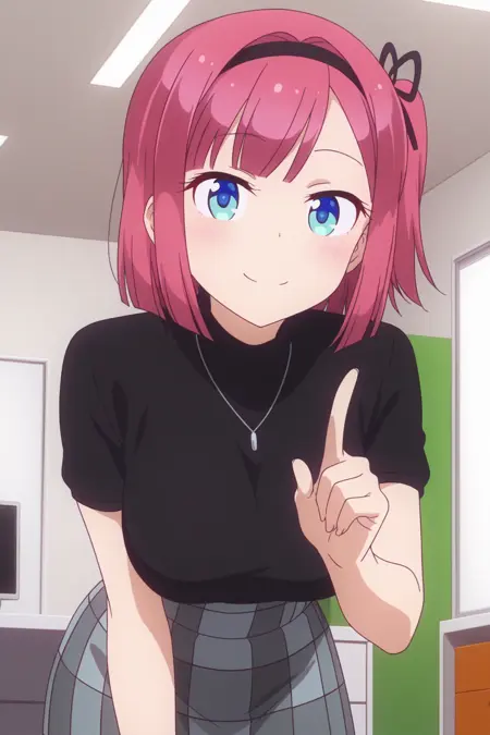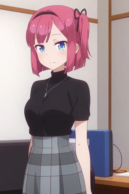aamomiji, blue eyes, red hair, one side up, black hairband, hair ribbon, momijicasual, necklace, black shirt, turtleneck, short sleeves, grey skirt, high-waist skirt, plaid skirt,