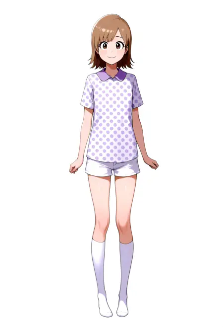 波点衬衫服装提示词:collared shirt, polka dot, white shorts, white kneehighs