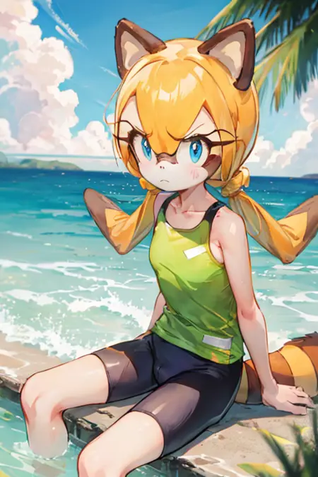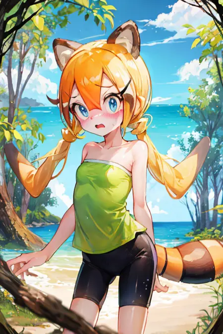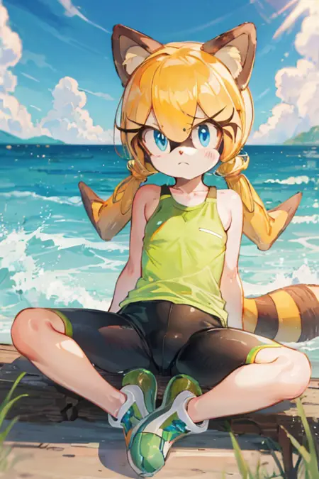 Use sthmarine to summon her,use body fur, raccoon ears, raccoon tail, blue eyes, bike shorts to form her apperance.