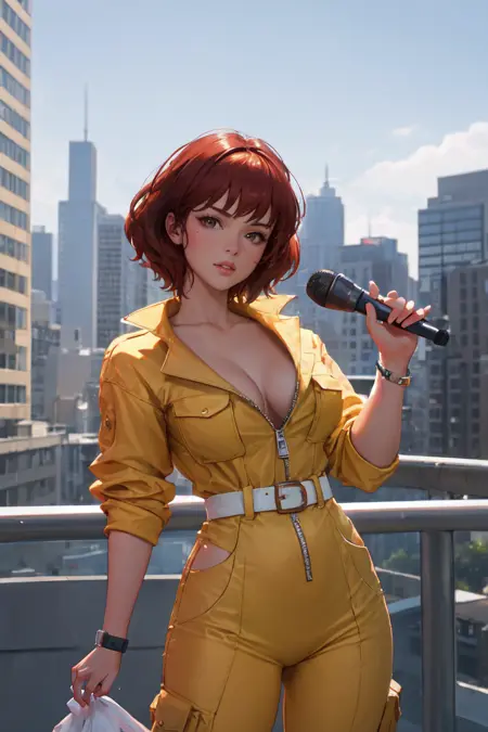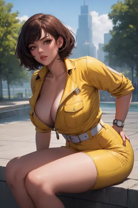 - cleavage, sleeves rolled up, yellow jumpsuit, watch, unzipped, zipper, white belt,