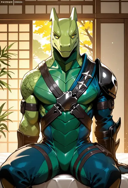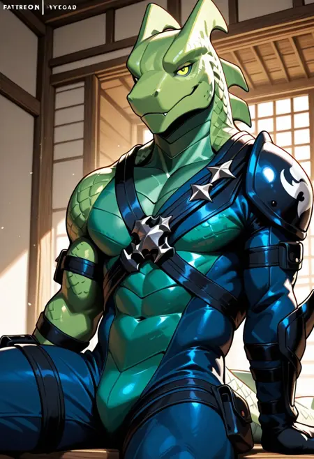 Anthro,lizard,hybrid,green body,ninja outfit,yellow eyes,scalie