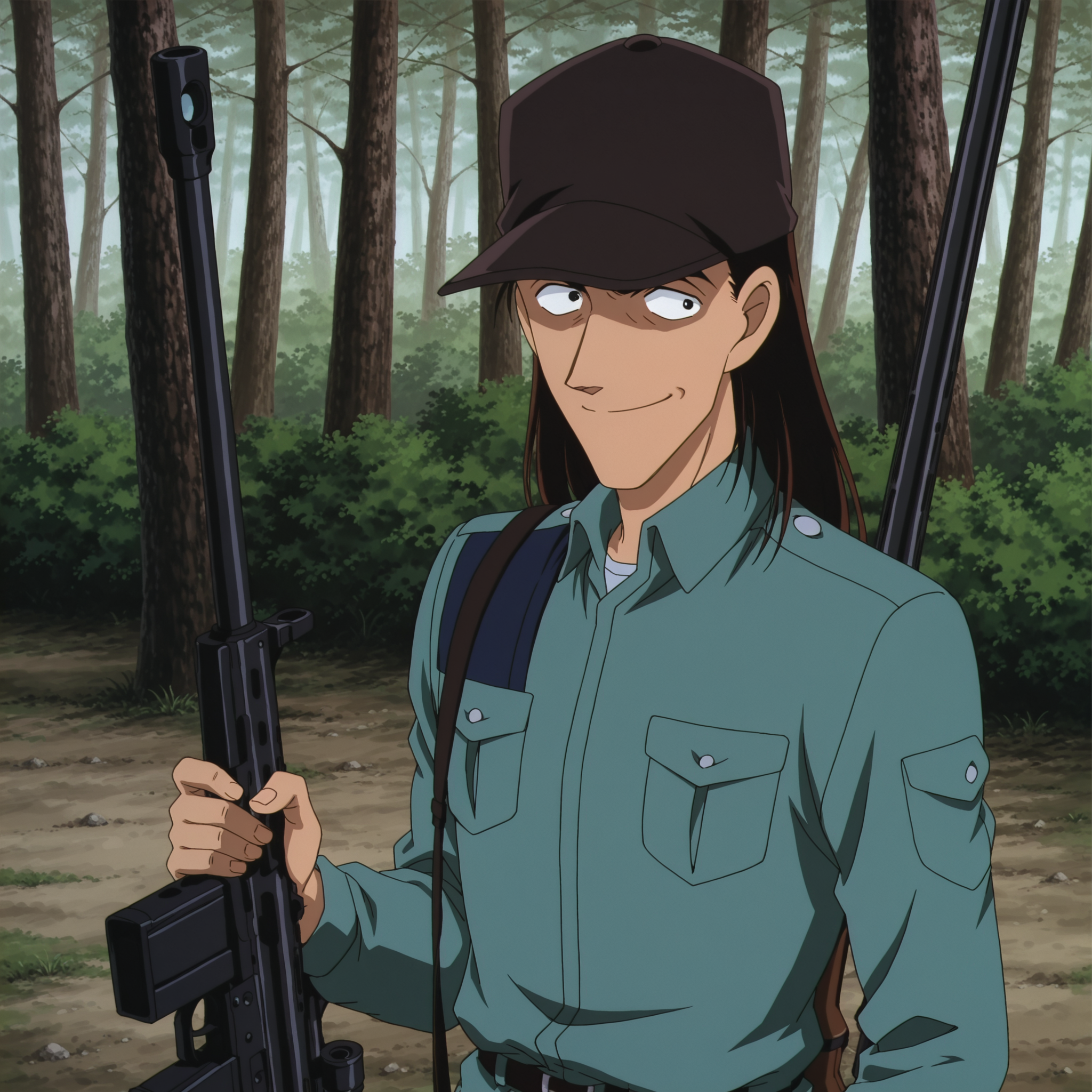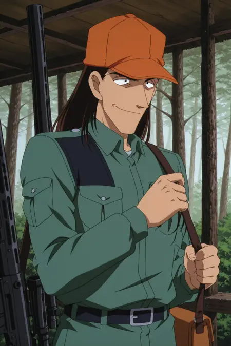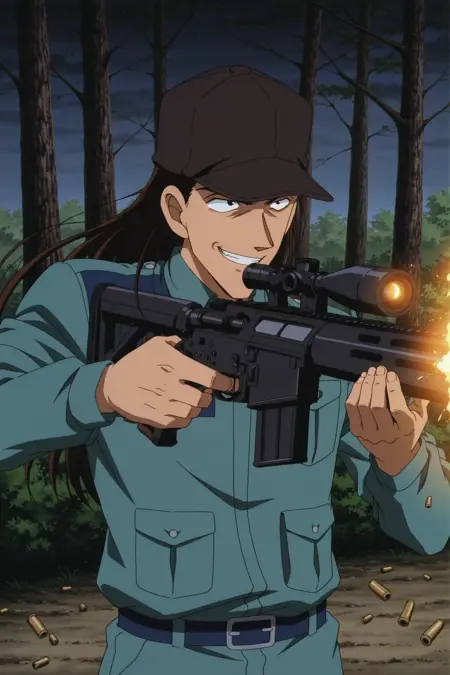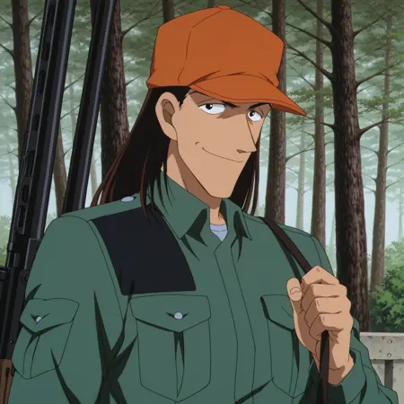 2010s \(스타일\), detective_conan_tomoya_negoro, 갈색 머리, 긴 머리, 검은 눈, 미소, 주황색 두건, 군복, 바지, 부츠, 샷건