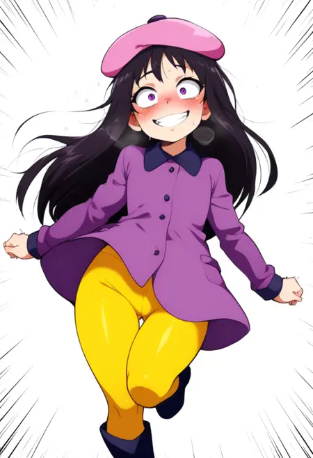 黑发,贝雷帽,紫色外套,黄色连裤袜,手套