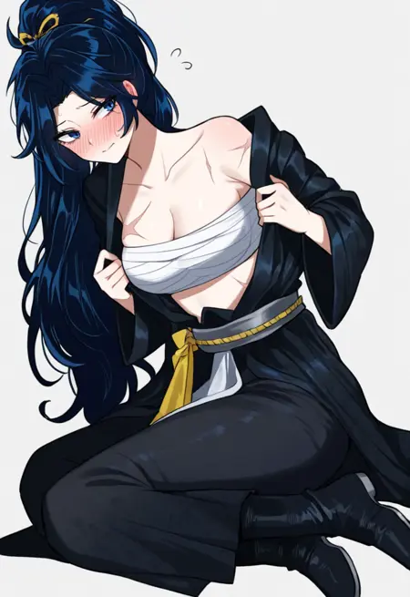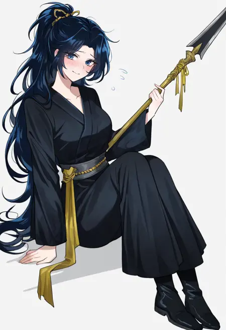 blue eyes, long hair, high ponytail, golden ribbon, dark blue hair