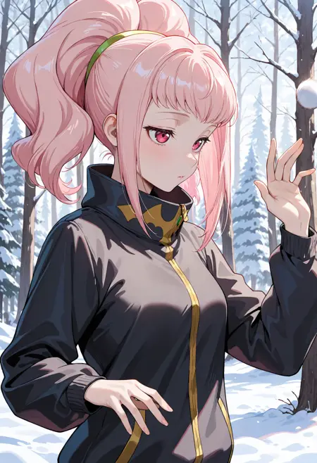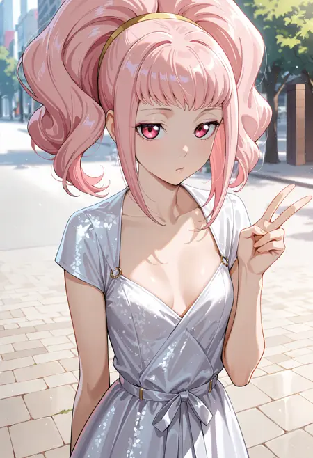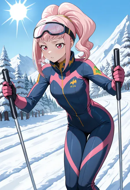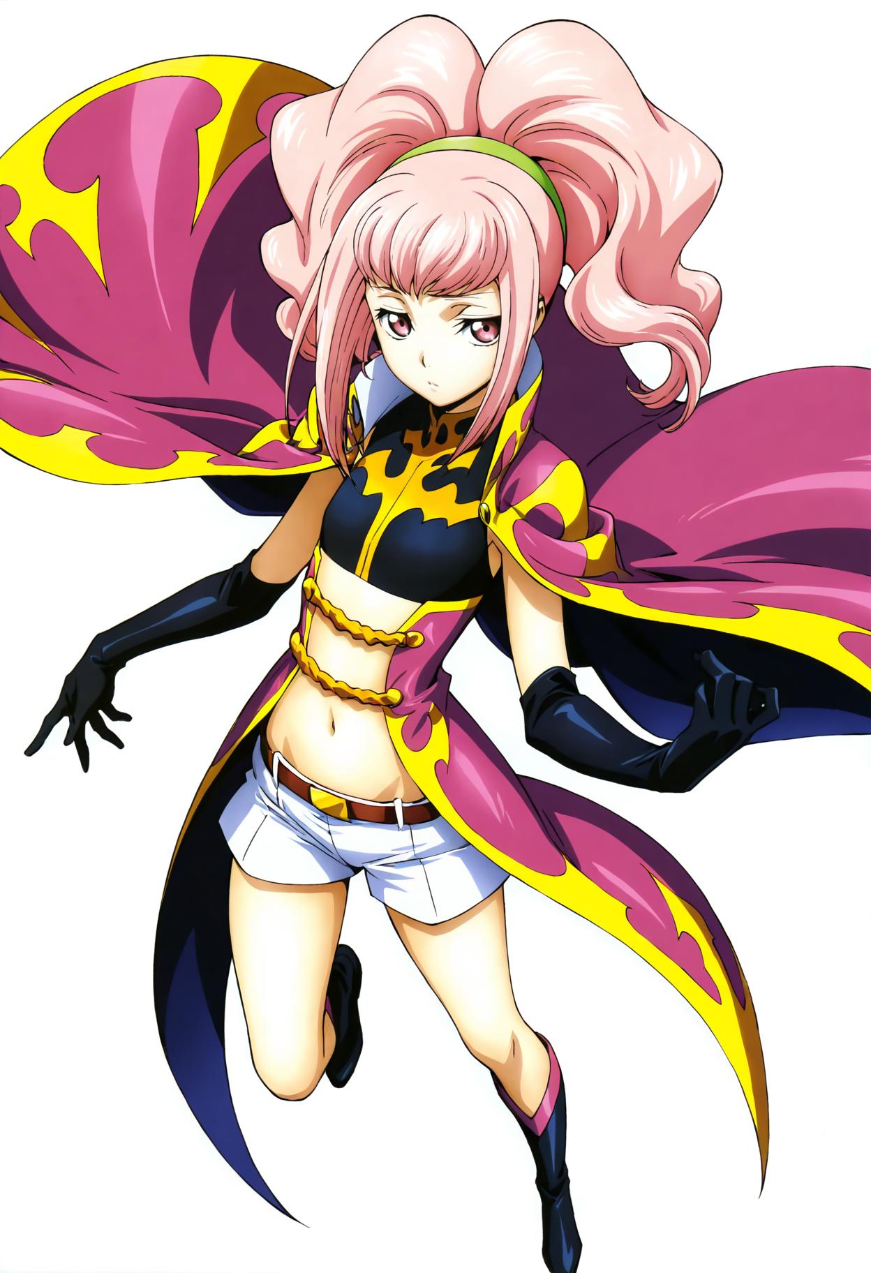衣装1: 1人の少女、ピンクの髪、手袋、ショートパンツ、へそ、腹筋、マント、ピンクの目、白いショートパンツ、黒い手袋、小さな胸、肘まである手袋、ポニーテール、ヘアバンド、ベルト、長い髪、短いショートパンツ