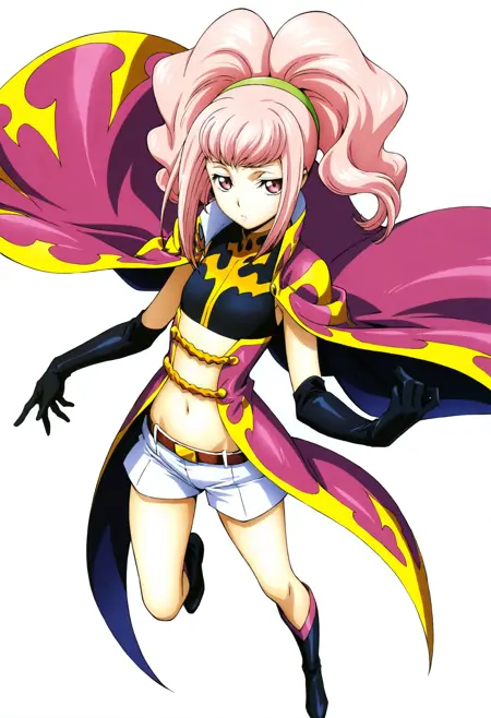 Outfit 1: 1girl, pink hair, gloves, shorts, navel, midriff, cape, pink eyes, white shorts, black gloves, small chest, elbow gloves, ponytail, hairband, belt, long hair, short shorts