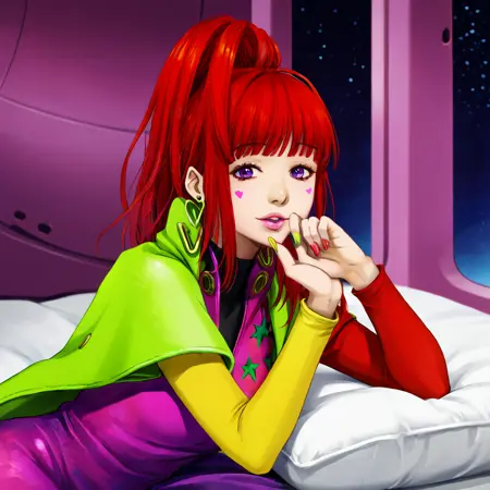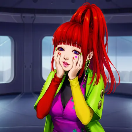 1girl, ((best quality)), ((masterpiece)), (detailed), sq, 红发,, 黑色高领衫, 饰品,, 霓虹粉紧身衣,, 耳环,, 妆容,, 高领,, 夹克,, 红色右手套,, 黄色左手套,, 紫色眼睛,, 霓虹粉裙子,, 心形, 霓虹绿夹克,, 齐刘海,, 大胸, 面部标记
