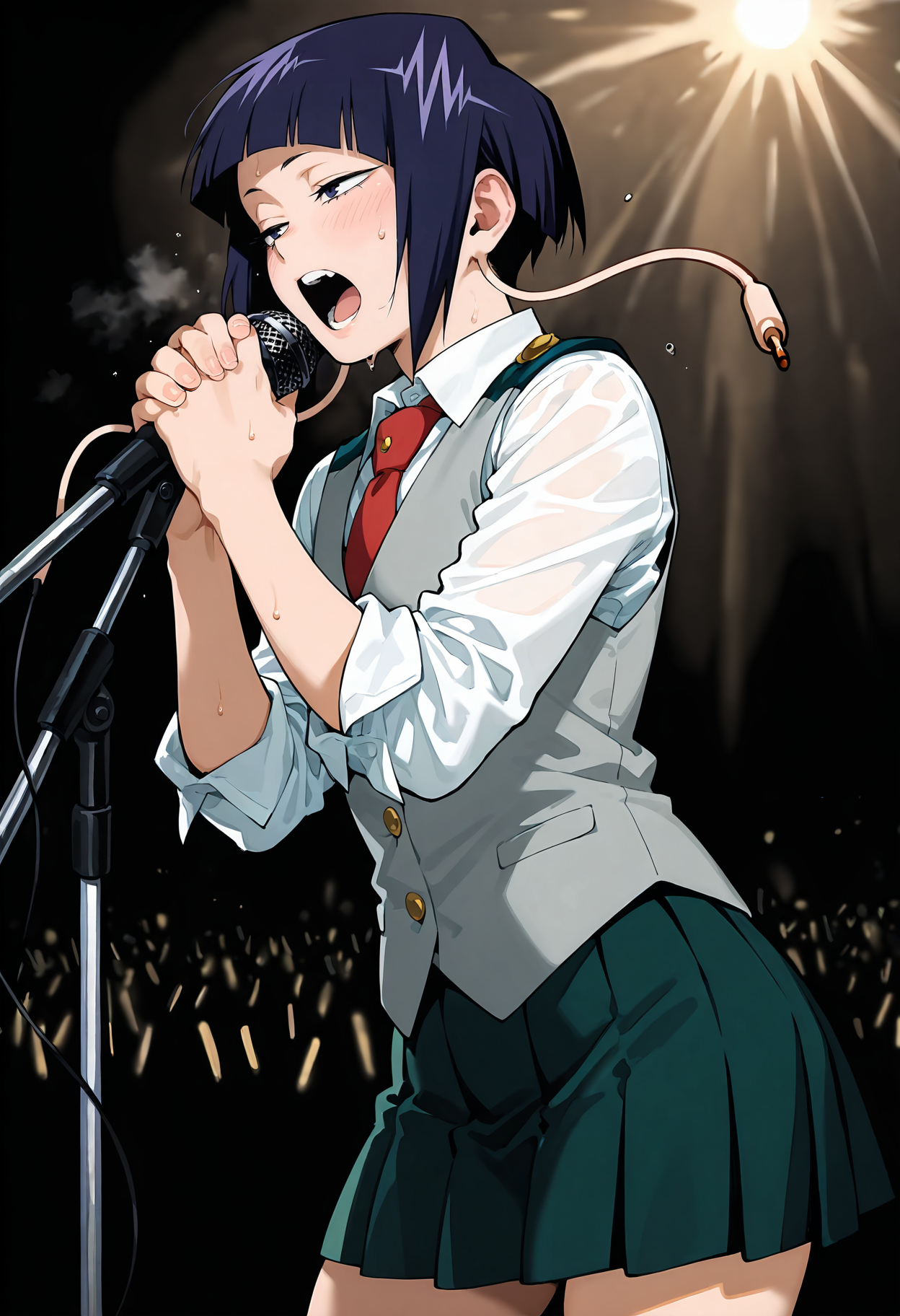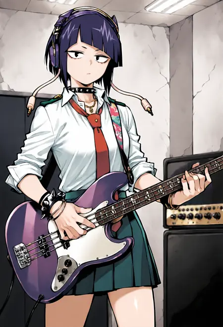 옷 1: 넥타이, 치마, 보석, 팔찌, 빨간 넥타이, 셔츠, 접힌 치마, 헤드폰, 단발, 학교 유니폼, 흰색 셔츠, 앞머리, 둔한 앞머리, 녹색 치마, 칼라 셔츠, 초커, U.A. 학교 유니폼, 목걸이, 파란 머리, 보라색 머리, 소매 말아 올린, 손목밴드, 검은 눈, 칼라, 드레스 셔츠, 느슨한 넥타이, 파란 치마, 미니 스커트, 긴 귀lobes, 날개 칼라, 아쿠아 치마, 스파이크, 스파이크 달린 초커, 스파이크 달린 팔찌
