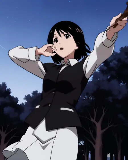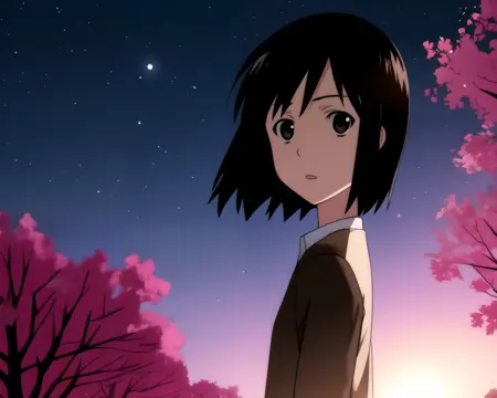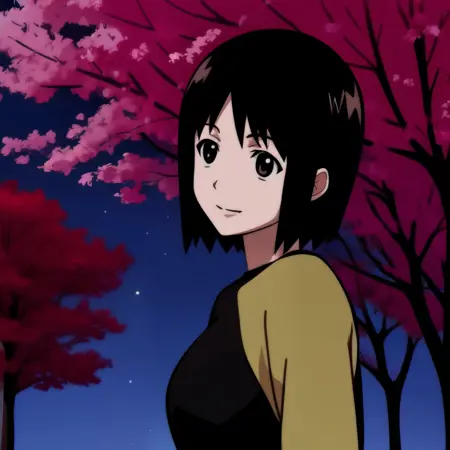 기본(Var1): nakahara misaki, 단발, 검은 머리, 갈색 눈, 검은 눈, (raglan sleeves:1.3), 야외, 하늘, 나무, 밤, 별(하늘), 야경