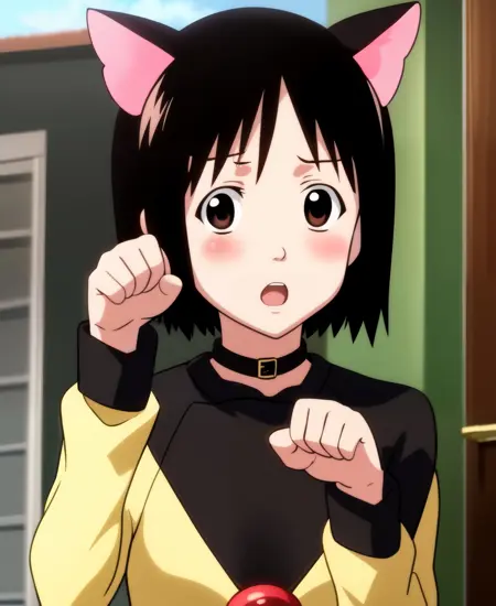 kitty(Var3): nakahara misaki, 1girl, 솔로, 단발, 검은 머리, 갈색 눈, 검은 눈, 뺨이 붉음, 입 벌림, 고양이 귀, 목줄, 종, (neck bell:0.3), :o, (다크 그린 스웨터:0.6), (노란 스웨터:0.3), raglan sleeves, 보는 시선, 발 모양