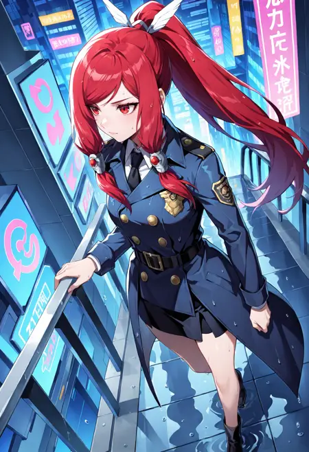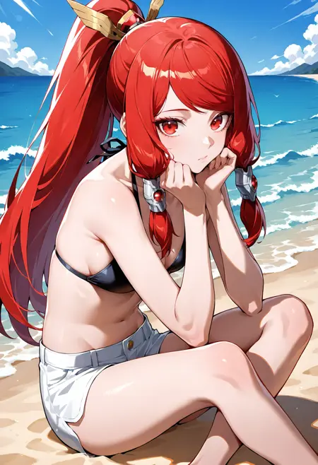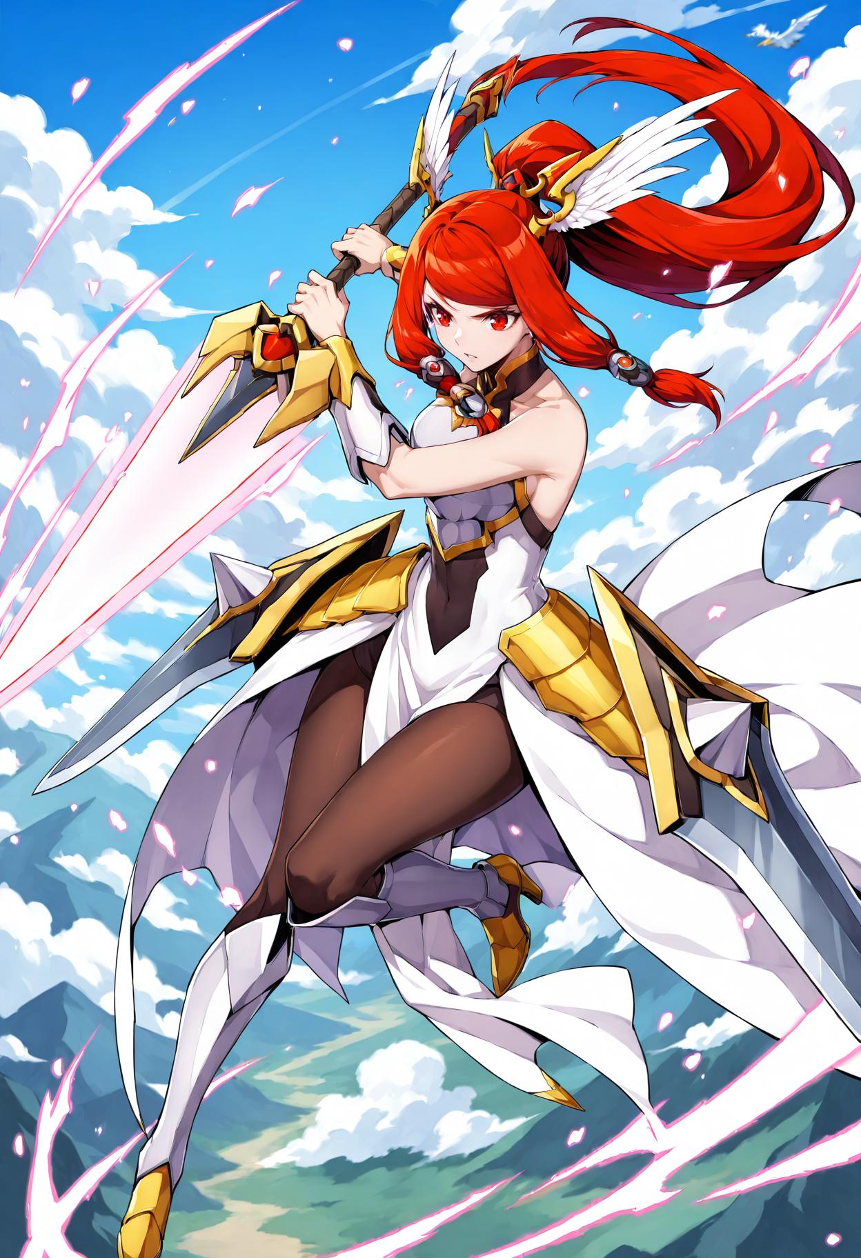 衣装: 1人の少女、赤髪、赤い目、長い髪、鎧、タイツ、胸甲、裸の肩、ポニーテール、ブーツ、髪のチューブ、サイドロックス、腕甲、茶色のタイツ、髪飾り、ファウルズ、頭部の翼、前髪、鎧のドレス、ツインテール、ハイヒール、脛当て、ノースリーブ、ドレス、骨盤カーテン、なびく前髪、膝丈ブーツ、鎧のブーツ