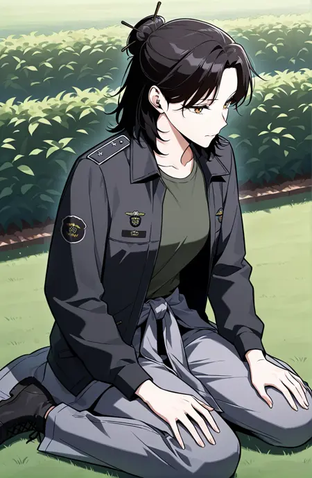 dark jacket, military-style jacket, green t-shirt, grey jacket tied at waist, cargo pants, combat boots,