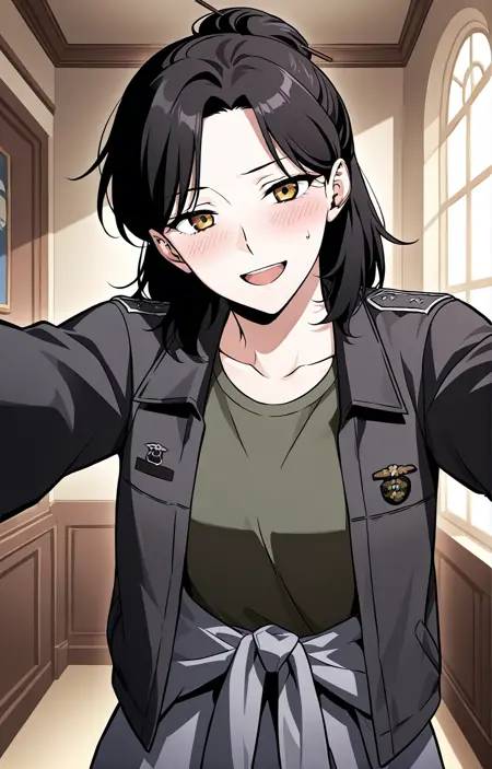 1girl, solo, long hair, black hair, tied hair, half-up hairstyle, side strands, amber eyes, yellow brown eyes,