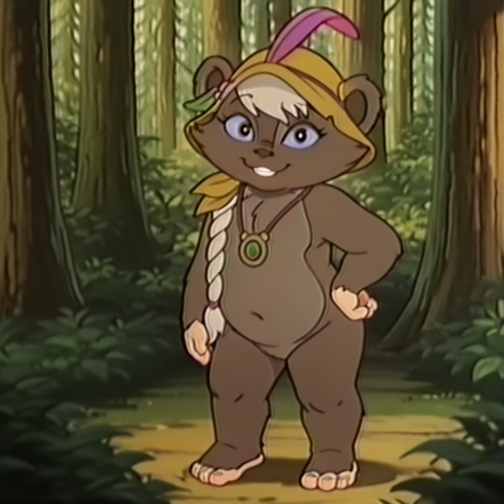LataraSWEil, semi-anthro, female ewok, brown fur, white hair, hair braid, black eyes, blue sclera, yellow hat, pink hatfeather, necklace, gold pendant green gem