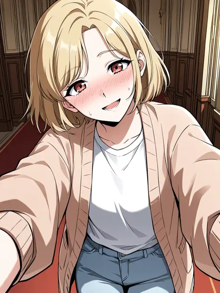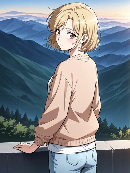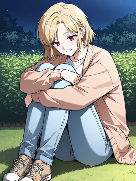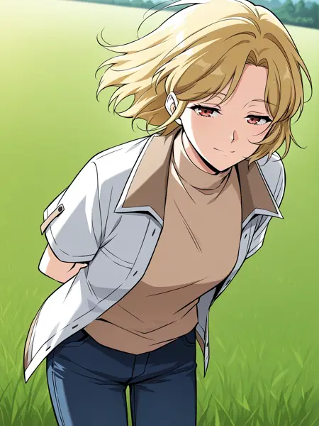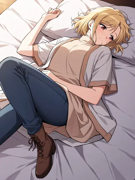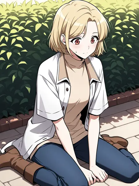 1girl, solo, short hair, blonde hair, soft expression, light skin, red eyes,