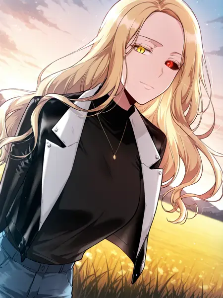 1girl, solo, long hair, wavy hair, blonde hair, side part, heterochromia, yellow right eye, red left eye, black sclera (left eye),