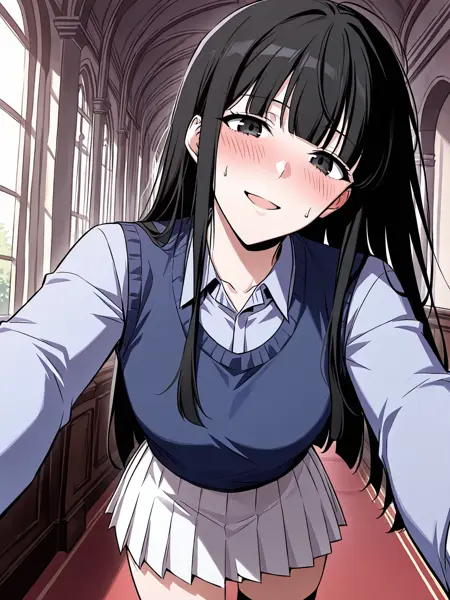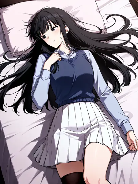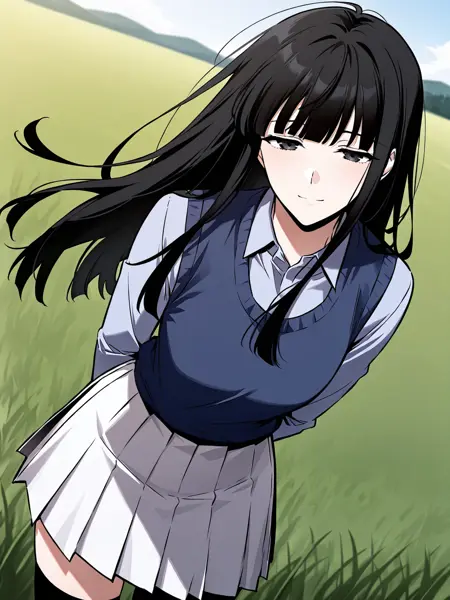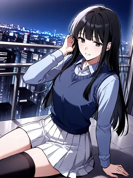 school uniform, blue sleeveless sweater, light blue shirt, white pleated skirt, black thighhighs, asymmetrical legwear,