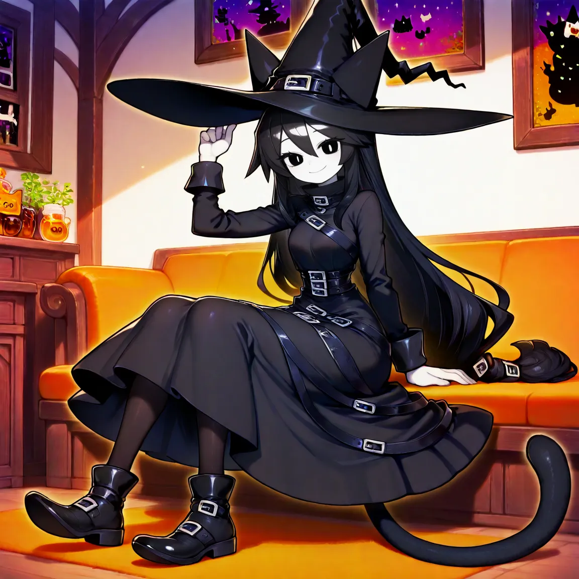 옷 - 동물 모자, 벨트, 고양이 모자, 마녀 모자, 귀가 달린 모자, 검은 드레스, 검은 팬티스타킹, 검은 신발