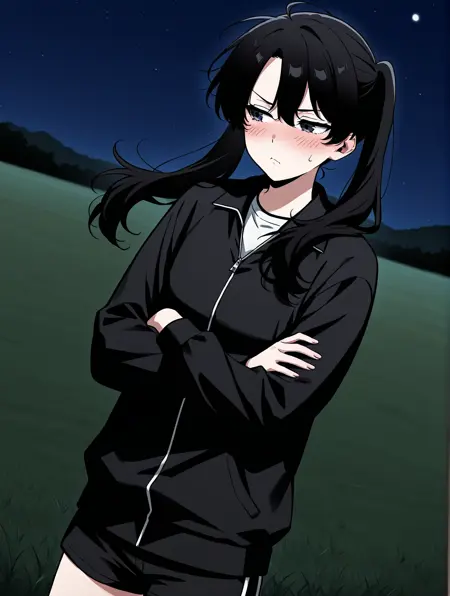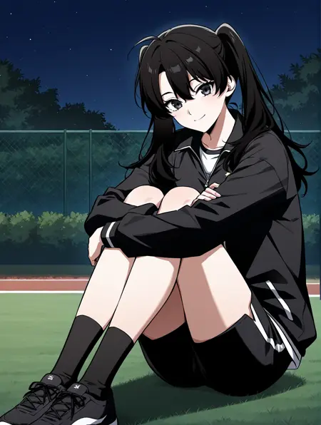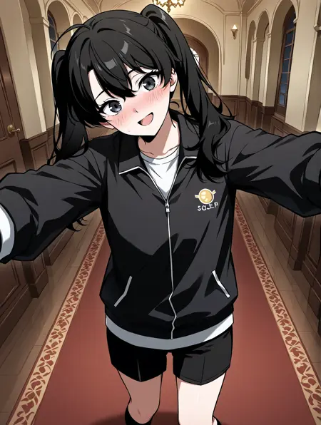 1girl, solo, black hair, long hair, twintails, low twintails, hair between eyes, ahoge, black eyes,