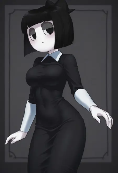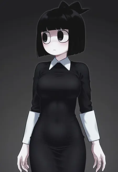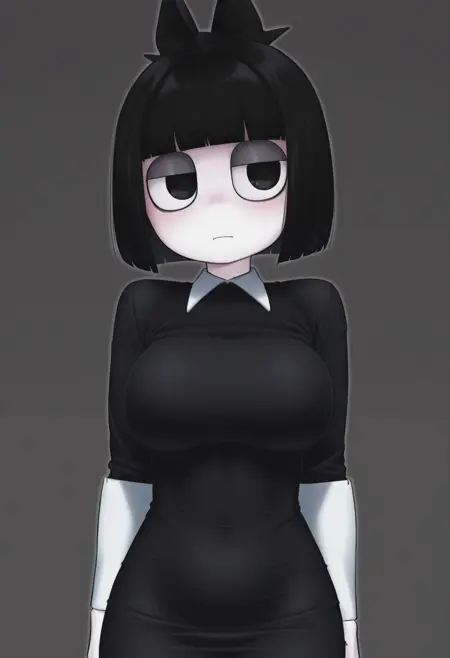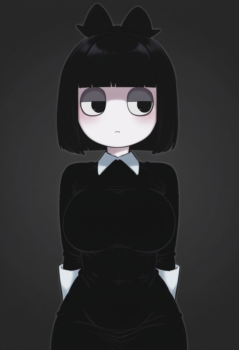 タグ: creepysusieILL バッサリした前髪、黒髪、短髪、長い黒いドレス、黒い目、ボブカット