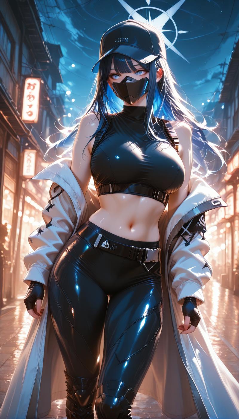 ロングスリーブ、手袋、帽子、へそ、肩出し、ブーツ、オープンな服、ノースリーブ、黒い手袋、ズボン、ベルト、お腹、腹部、指なし手袋、黒い靴、オフショルダー、コート、クロップドトップ、黒いシャツ、黒い頭部装具、ノースリーブシャツ、浮遊する髪、マスク、黒いズボン、膝上ブーツ、野球キャップ、バックル、黒いベルト、オープンコート、クロスラッキング靴、白いコート、きらめき、マウスマスク、アンダーバスト、レースアップブーツ、レギンス、ハーネス、胸ハーネス、黒いマスク、スナップフィットバックル、白いジャケット、