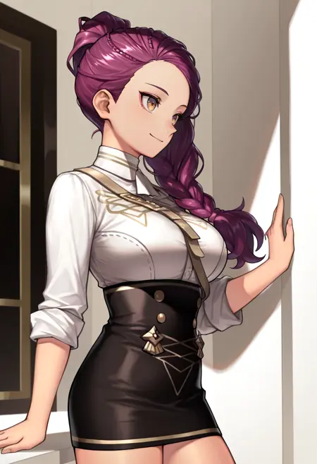 加雷马赫制服:petra-gmu,发辫,高马尾,金色镶边,高腰裙,过膝靴,白衬衫,微笑,单条发辫,发丝垂肩,领结,额头,棕色眼睛,面部纹印