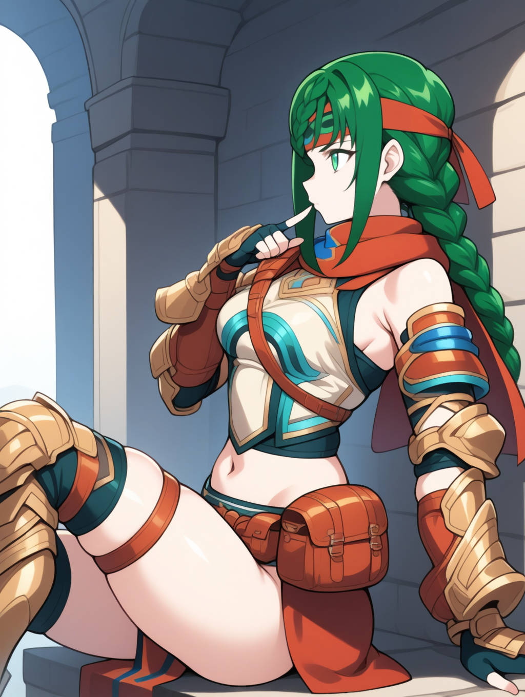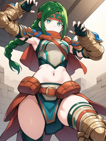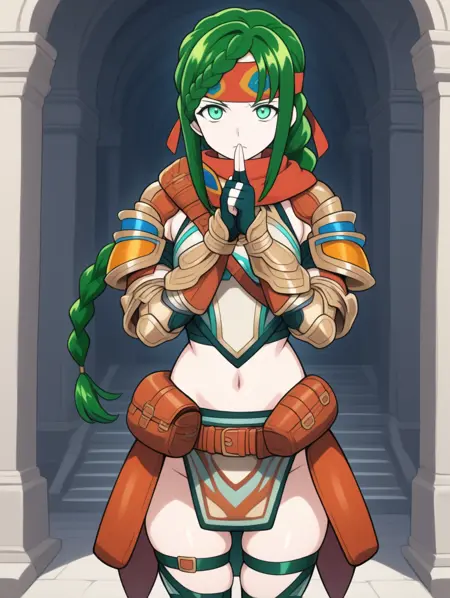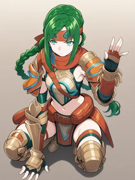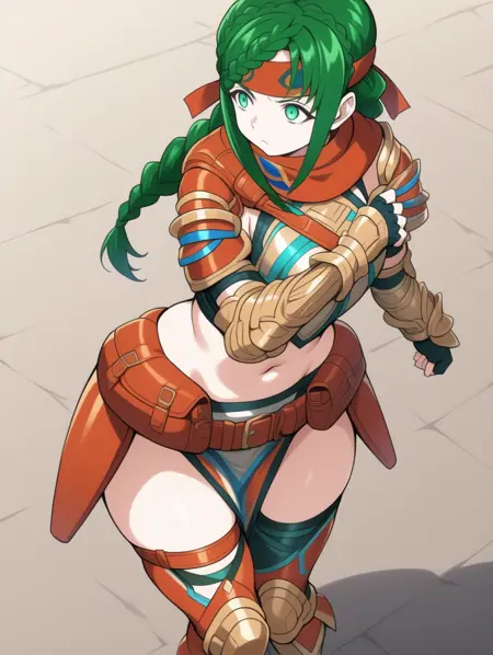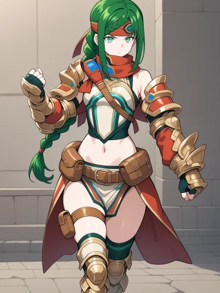 prompt example :,annnu,green hair,long hair,headband,scarf,green eyes,armor,gauntlets,fingerless gloves,navel,sleeveless,shoulder bag,pelvic curtain,belt pouch,thigh strap,braided ponytail,braided bangs,armored boots,thighhighs,