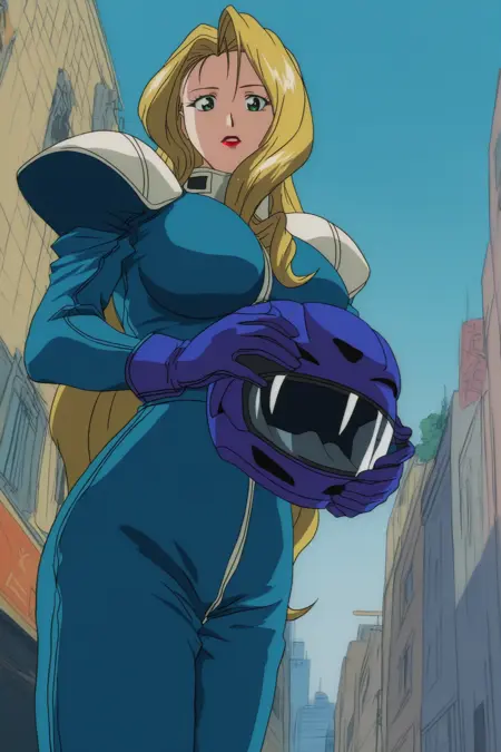 Biker Suit, Helmet Off: biker clothes, bikesuit, blue bodysuit, gloves, shoulder pads, holding unworn helmet,