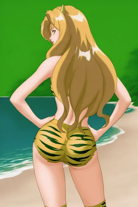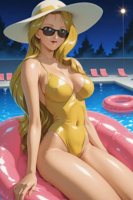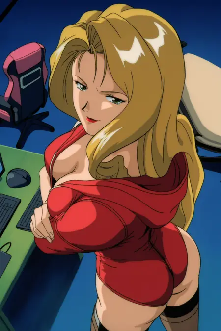 Main Prompts: Rex, long blonde hair, green eyes, makeup, red lips, large breasts, retro artstyle, 1990s (style)