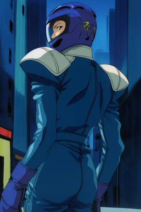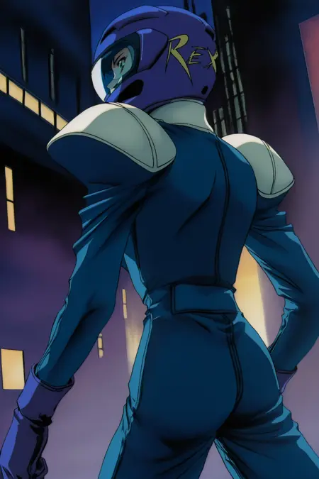 Note: Use the prompts "from behind, looking at nothing" to get "REX" carved into the back of the helmet. Also, if you want her hair tucked under her helmet, remove "long blond hair". She doesn't always tuck her hair in in the show.