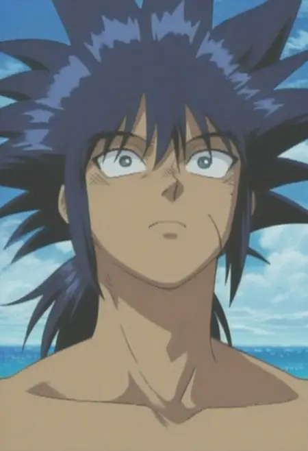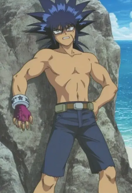MakoRyota, black-blue hair, spiky hair, ponytail, dark green eyes, face scar, diving mask on head, shirtless, single right bracelet, single right red fingerless glove, belt, blue ripped long shorts