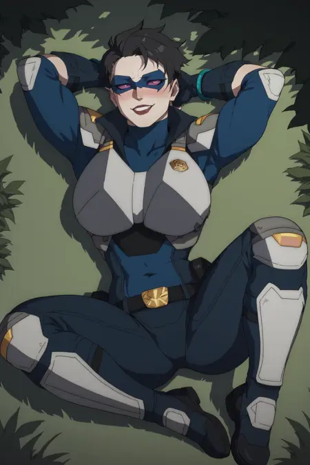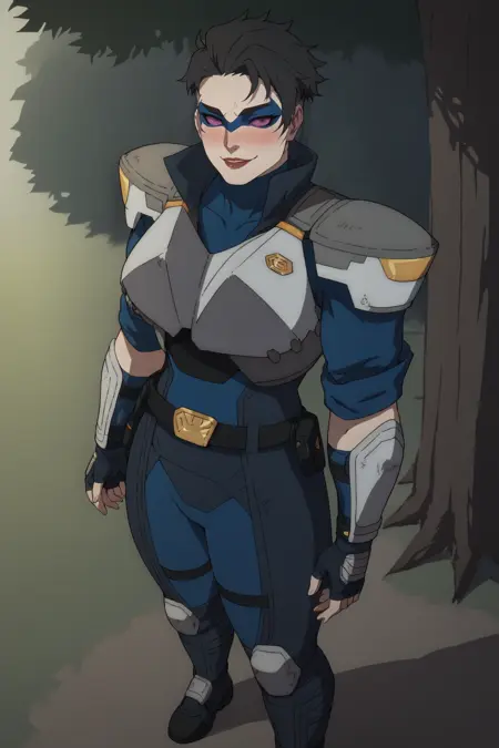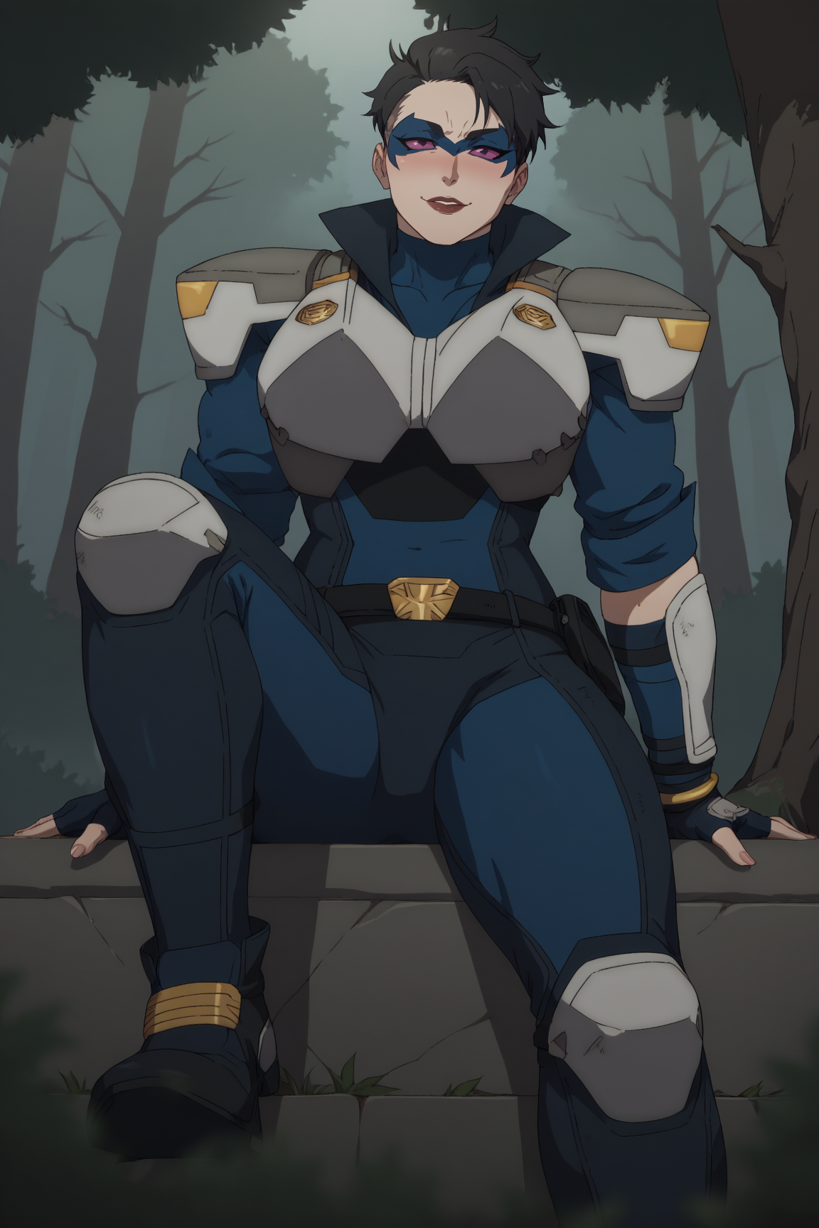 ➜ NinjaDMCPXL, 紫色の目, 青いマスク, 黒髪, 短髪, 大きな胸, 鎧の肩当て, 鎧, 青いボディスーツ, ブレスレット, 黒い手袋, 指なし手袋, 黒いベルト, 膝あて, 黒い靴
