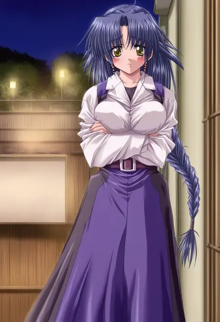 의상: 칼라 셔츠, 긴 소매, 보라색 치마, 긴 치마, 벨트,