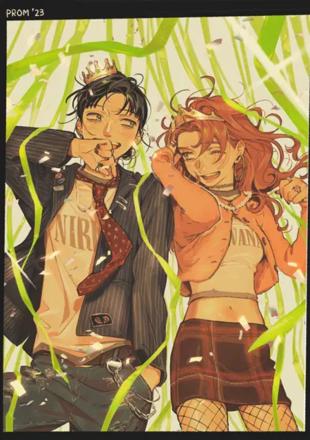 아야 오오사와, aya_rock1, 1girl, solo, 오렌지색 머리, 긴 머리, 곱슬머리, 귀걸이, 고리 귀걸이, 녹색 눈, 보석, 재킷, 티셔츠, 치마,