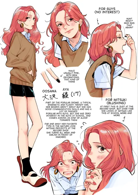 아야 오오사와, aya_academy1, 1girl, solo, 오렌지색 머리, 긴 머리, 곱슬머리, 귀걸이, 고리 귀걸이, 녹색 눈, 보석, 학교 유니폼, 네일페인트, 치마, 양말, 검은 양말, 스니커즈, 흰 스니커즈,