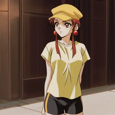 黄色い帽子用トリガー:Mai94MovieYellowHatOutfit, hat, brown hair, 1girl, solo, brown eyes, bike shorts, jewelry, earrings, shirt, short sleeves, sidelocks, cowboy shot