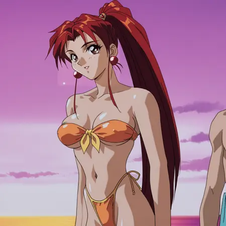 ビキニ用トリガー:Mai94MovieBikini, 1girl, swimsuit, strapless bikini, retro artstyle, jewelry, 1990s (style), earrings, red hair, large breasts, navel, long hair, ponytail, bandeau, cowboy shot