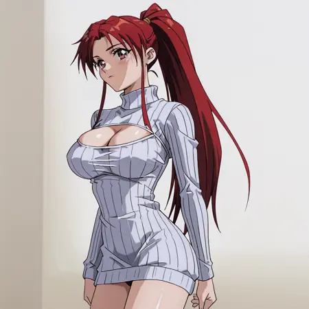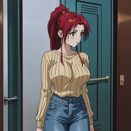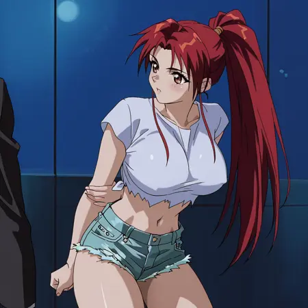 プール用衣装トリガー:Mai94MoviePoolOutfit, 1girl, long hair, midriff, red hair, ponytail, large breasts, navel, crop top, denim shorts, cutoffs, shirt, cowboy shot