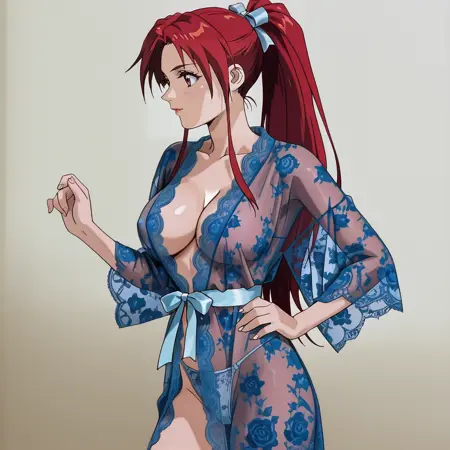 パジャマ用トリガー:Mai94MoviePajamas, 1girl, long hair, retro artstyle, 1990s (style), japanese clothes, kimono, brown eyes, red hair, breasts, blanket, cleavage, yukata, long sleeves, cowboy shot
