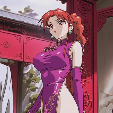 中国風衣装用トリガー:Mai94MovieChineseOutfit, 1girl, chinese clothes, china dress, jewelry, earrings, large breasts, lipstick, makeup, detached sleeves, red eyes, ponytail, long hair, red hair, cowboy shot