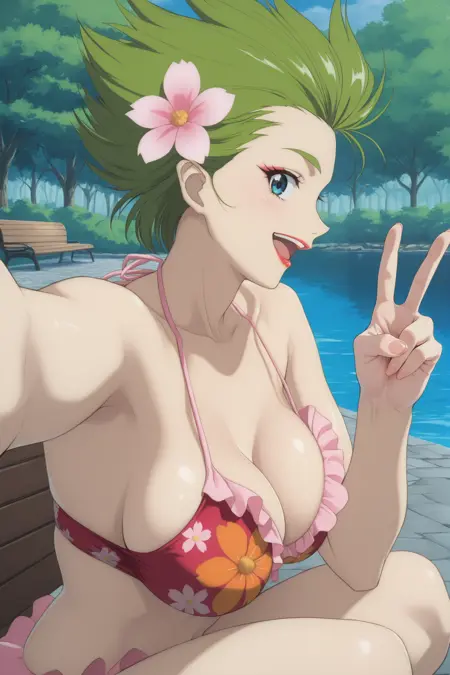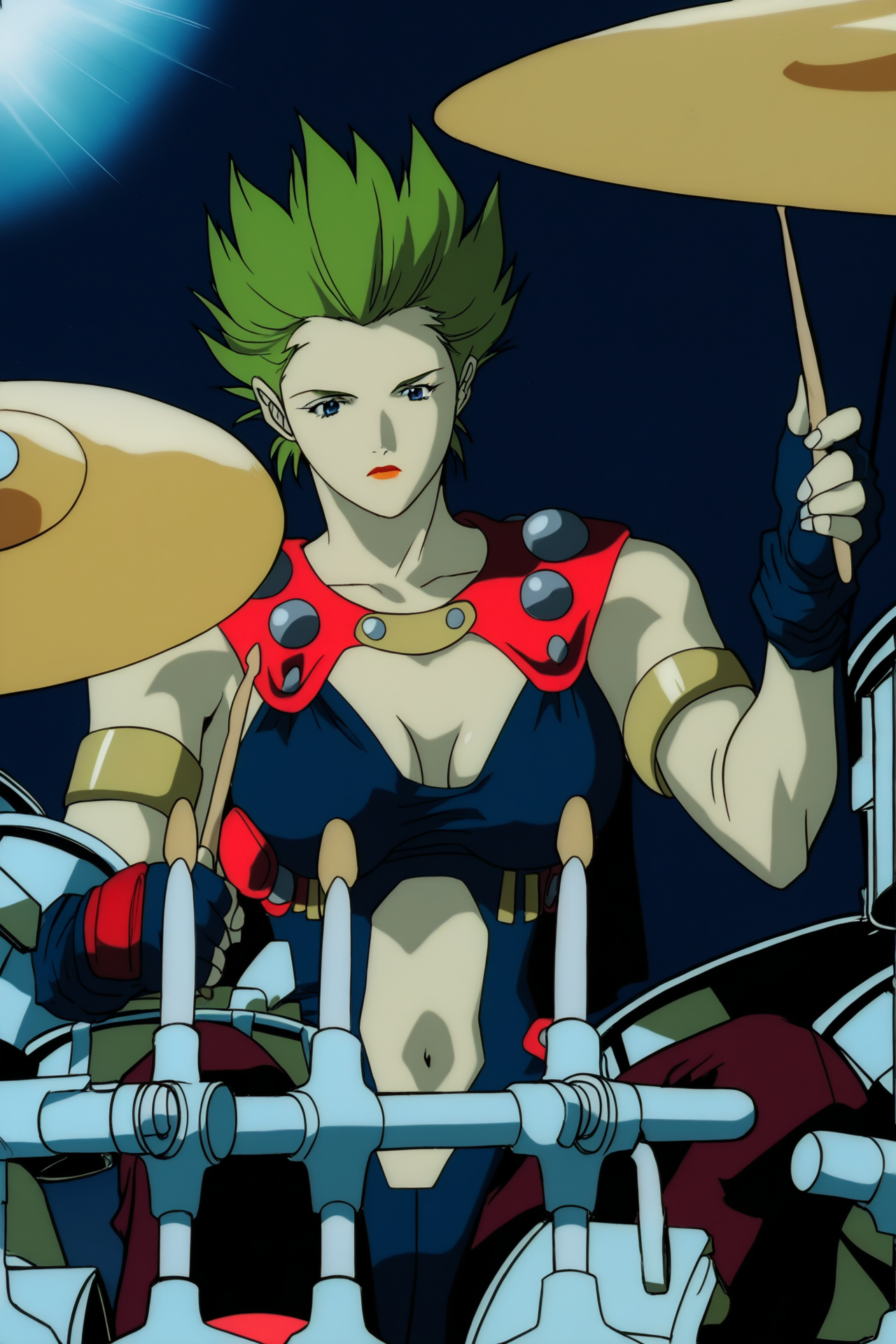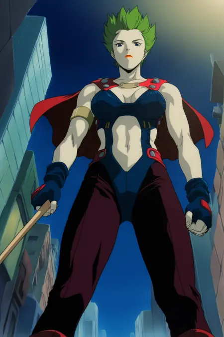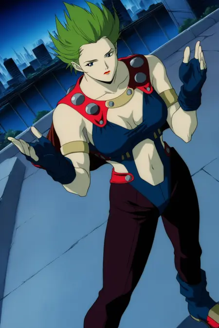 主提示词: Veffidas_Feaze,大乳房,绿色短发,刺猬头,口红,妆容,蓝眼睛,肌肉女性,复古艺术风格,1990年代(风格)